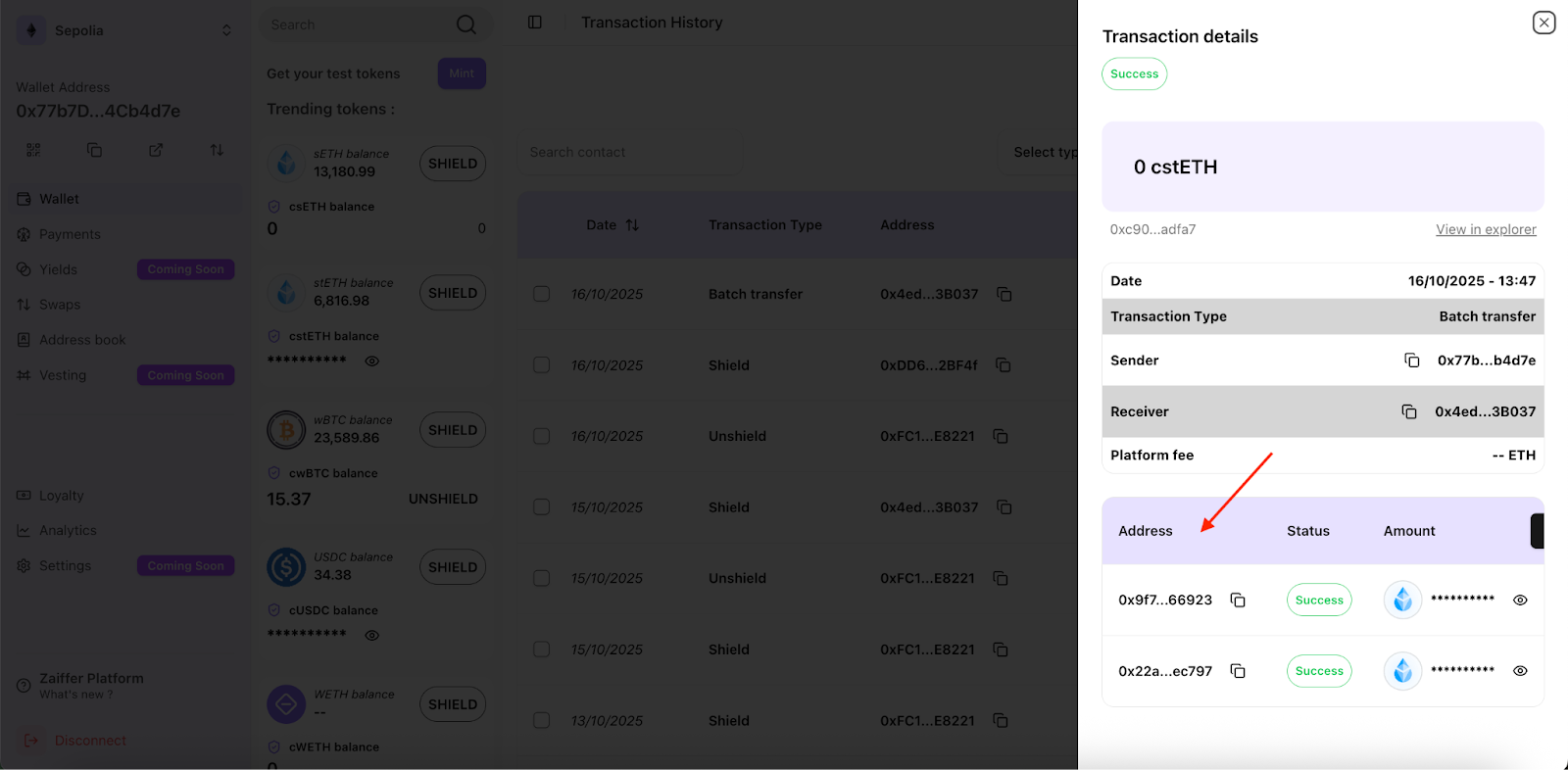 All of your transfer amounts are now revealed. As with all the amounts you reveal on Zaiffer, if you connect to your account with another device you will need to reveal your amounts again (as Zaiffer uses your device’s local storage to store your decrypted information for maximum privacy).