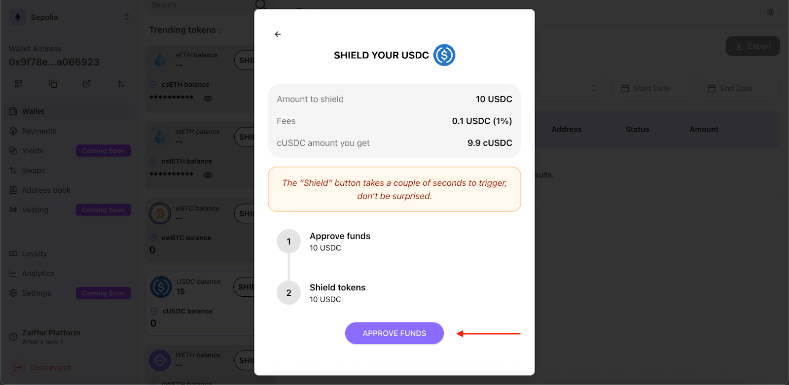To “Shield” your tokens on Zaiffer, navigate to the wallet section of the platform, select the token that you want to shield and click on the “Shield” button.